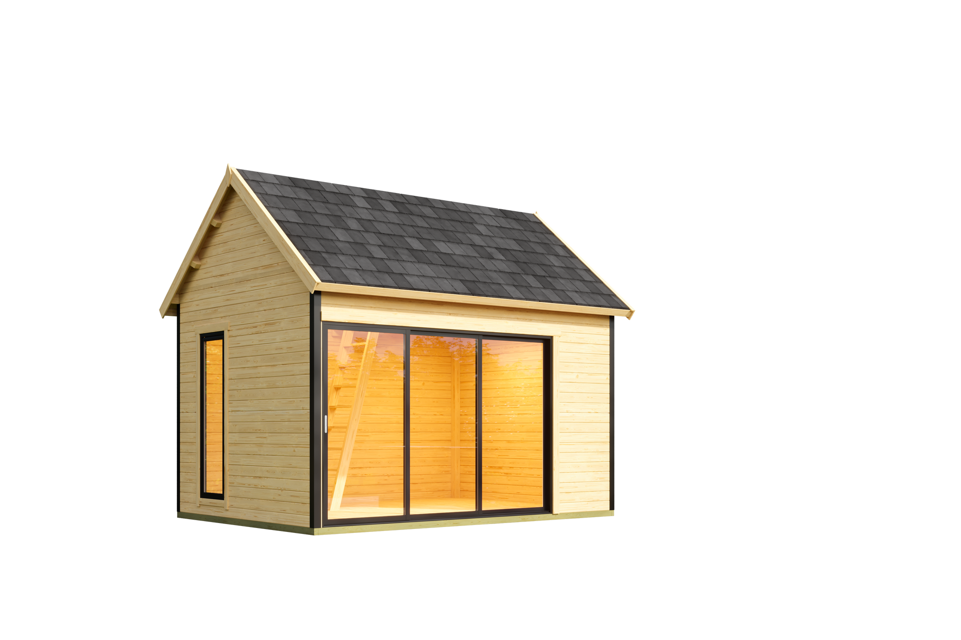 The Chic-Shed Aspen 2 is a spacious 13 x 10 solid wood garden shed featuring a double sloped roof and a mezzanine that makes it unique. It has large windows allowing for abundant natural light. This model is perfect for a garden office, yoga studio, creative workspace or even a pool shed. Crafted from 100% Nordic wood, the Aspen 2 can be stained or painted to complement any outdoor decor. The prefabricated kit includes precisely cut pieces and all necessary hardware, ensuring a smooth assembly process with just a few basic tools.